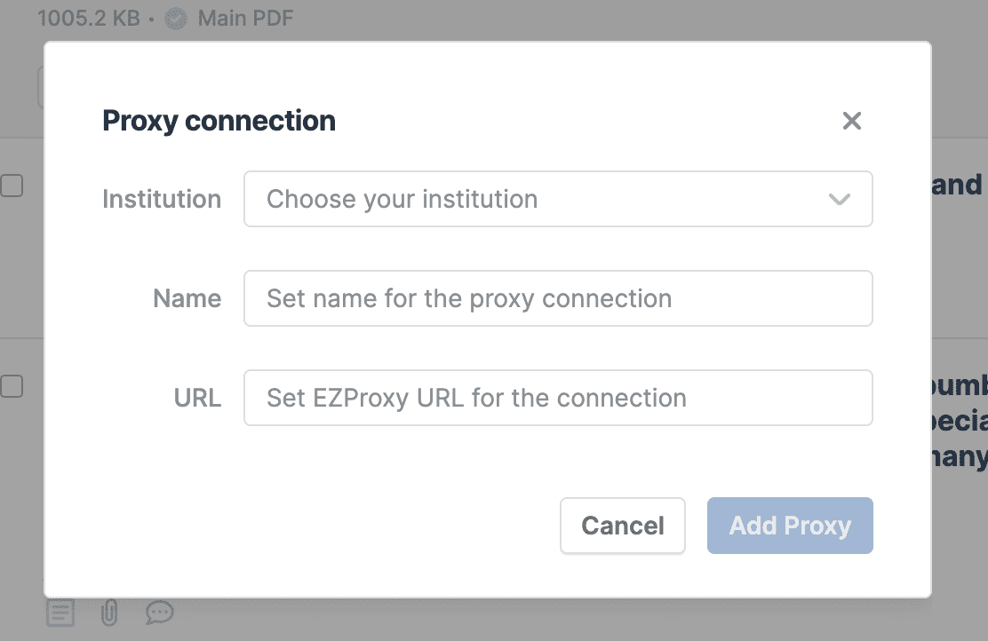 Other remote access technologies: Your institution might use other technologies for remote access than the "EZProxy" approach described here. Most popular are VPN connections or direct proxy servers. All these approaches are fully supported by Paperpile but need special programs or configuration of your computer. Please ask your library or IT department for more help.